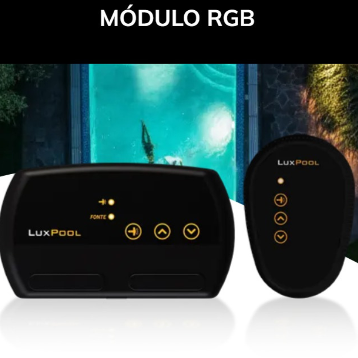 Modulo RGB com potencia maxima de 90w e alimentação 12vcc. Controle remoto para comando da iluminação RGB. Acompanha a fonte.